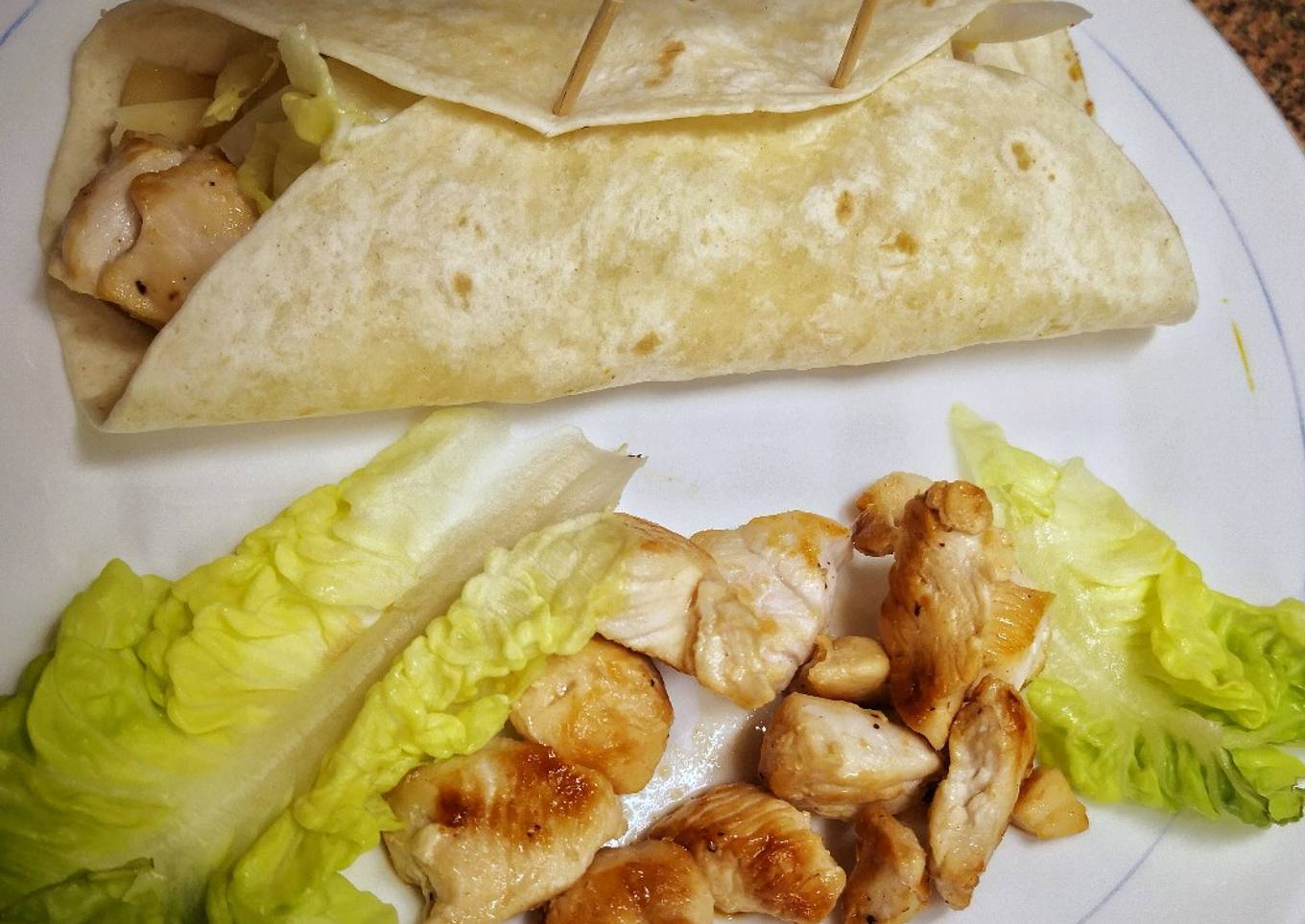 - Ahora, empezamos a preparar los kebabs! Todo lo pondremos en el centro de la tortilla. Pondremos dos o tres cucharaditas de tomate triturado en el centro, haciendo una lÃnea. Luego, pondremos un poco del pollo, lechuga, unas cucharaditas de maÃz, algunos trozos de cebolla (esto es al gusto de cada uno) y dos o tres cucharaditas de salsa de yogur. Enrollamos con cuidado y apretando un poco para que se pueda cerrar.