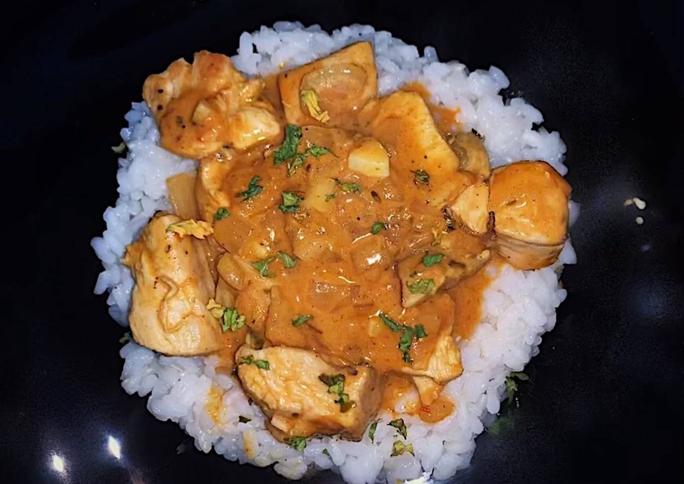 - Introducimos la leche de coco (lo que es la grasa que está al principio) y un poco de la leche, yo suelo echar una cucharada más de curry, dejamos cocinar 3 minutos más y listo para comer!!!! Yo lo acompañé con un arroz, pero podéis hacerlo con patatas, en tallarines, etc 🤩