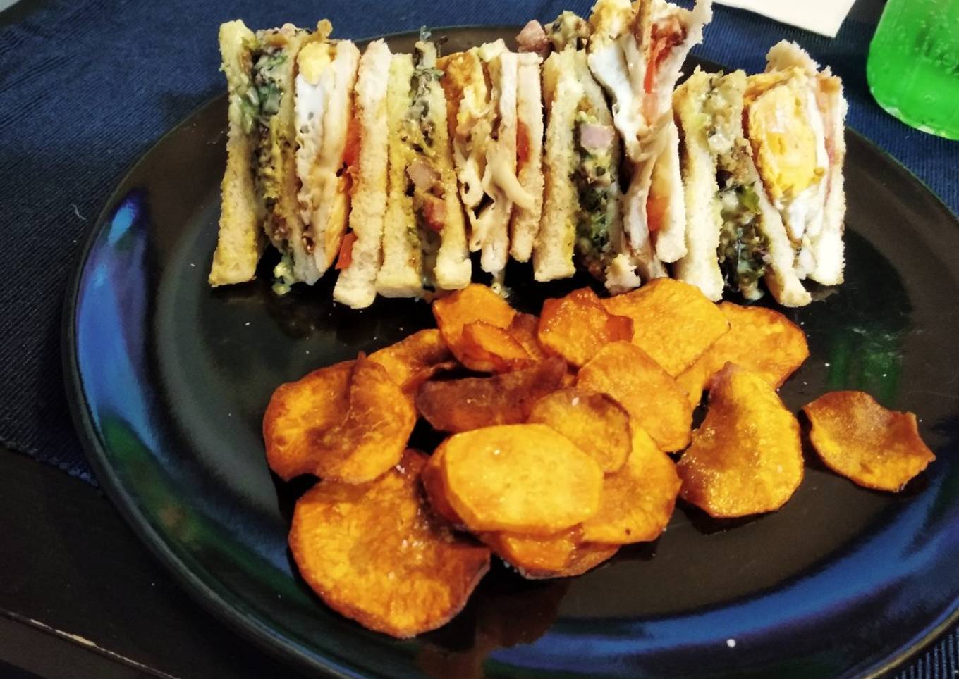 - Cortamos el sándwich en 4 triángulos y lo disponemos en el plato como en la foto. Yo lo he acompañado de chips de boniato.