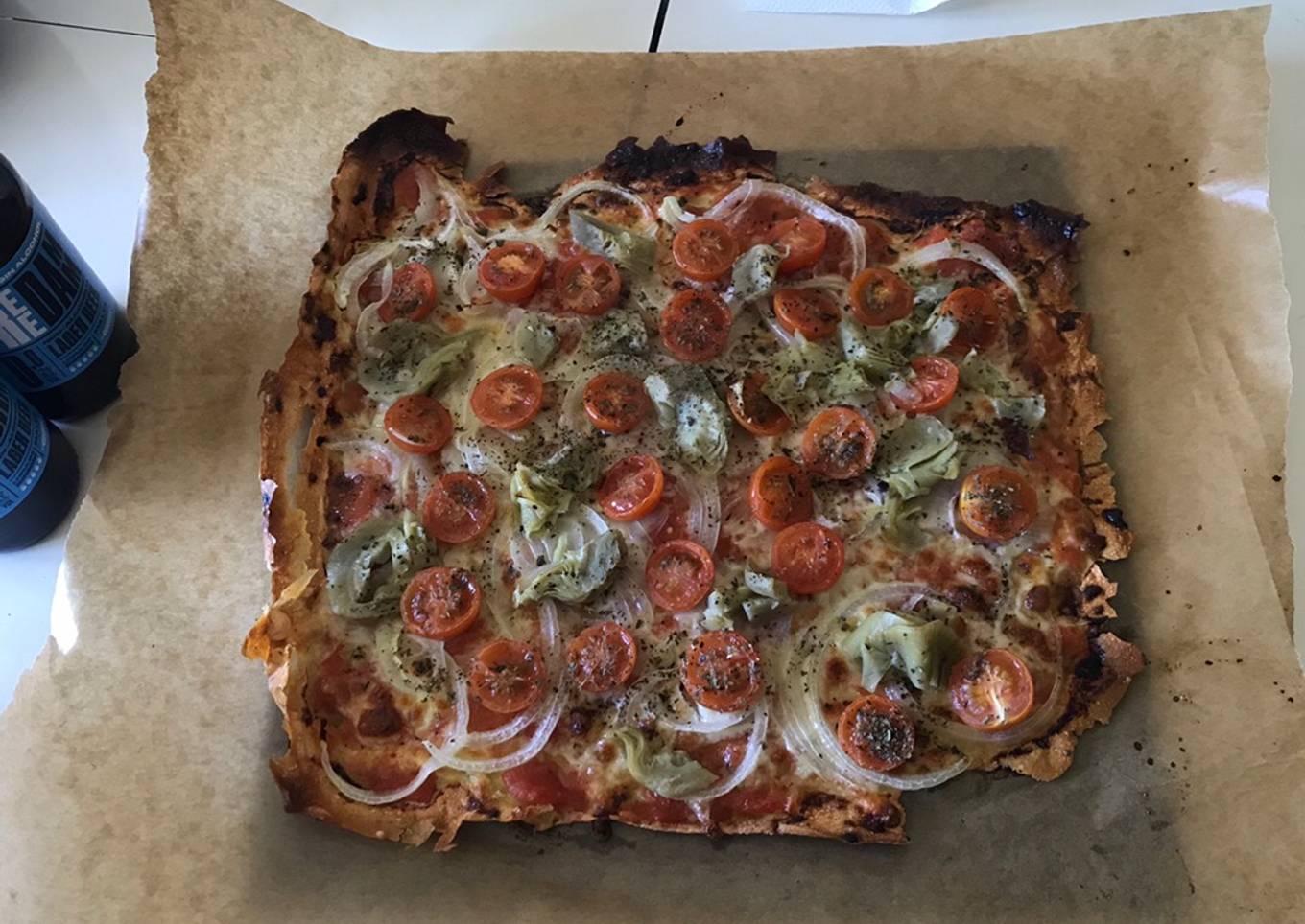 - La masa estará hecha, la sacamos del horno y añadimos los ingredientes que queramos: tomate frito y mozzarella, colocar los cherries, cebolla, y las alcachofas. Hornear unos 5 minutos y unos 2-3 minutos con el ventilador para que se tueste.