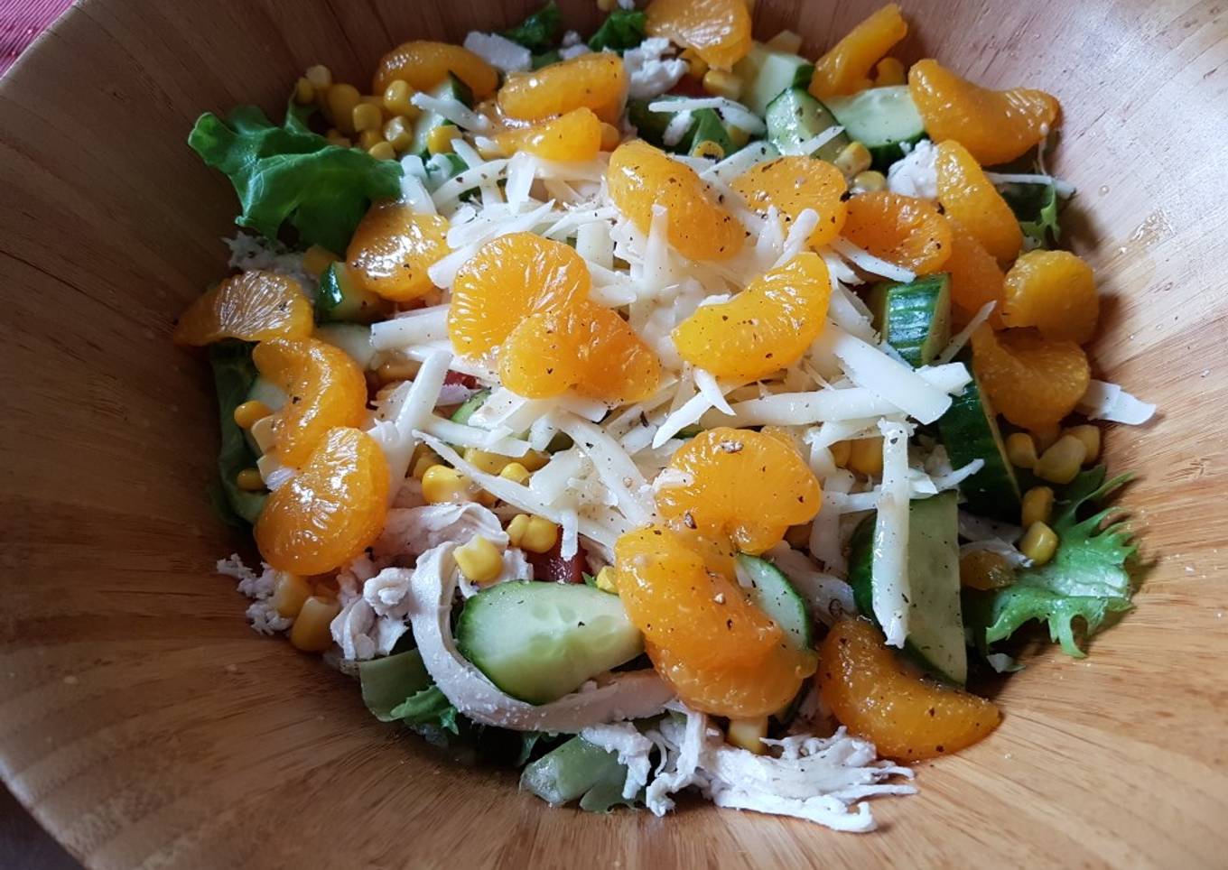 - A continuación, el pollo desmenuzado, el maíz dulce, el queso rallado y las mandarinas. Salpimentamos.